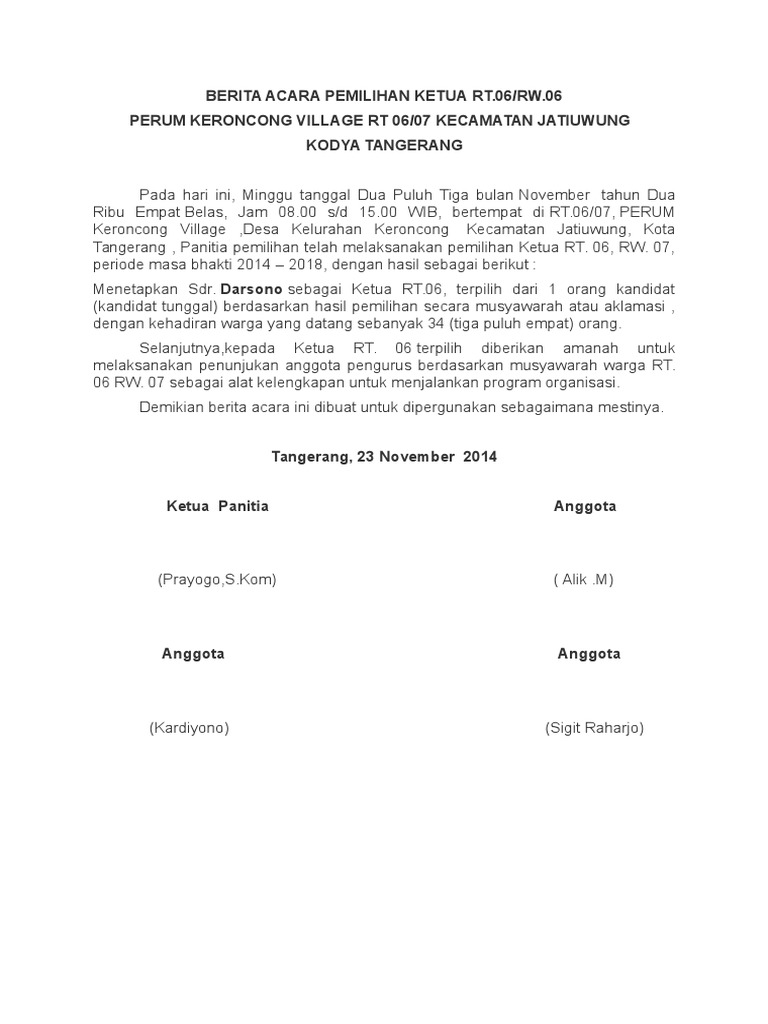 Tata cara dan alur pemilihan ketua rt dan ketua rw (lengkap) yang sudah diterapkan dan berhasil berjalan sukses sesuai keinginan panitia. Sementara contoh lainnya yaitu di kota tangerang, prosedur penggantian ketua rt yang mengundurkan diri dari jabatan ini. Muslich hamzah dibantu oleh 4 orang anggota yaitu. Masjid jami nur iman acara : Pada hari ini jumat malam sabtu tanggal 23 bulan januaritahun dua ribulimabelas, panitia pemilihan ketua rt melaksanakan pemungutan suara pemilihan ketua rt pemekaran rt.